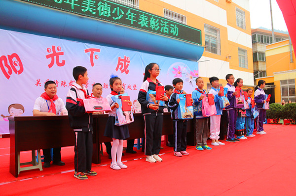 活动第一部分为表彰大会,为全县美德少年、三好学生、优秀学生干部、十佳儿童少年和先进班集体进行了颁奖。