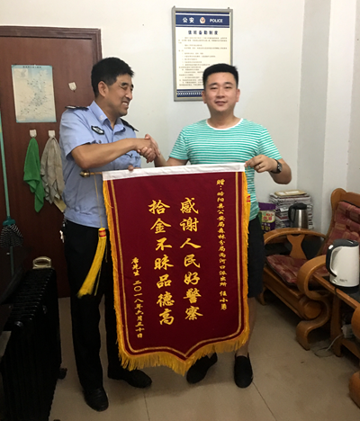 6月30日,在略阳县森林公安分局办公室失主唐某为森林公安民警任小勇送上锦旗,感谢其拾金不昧的精神。